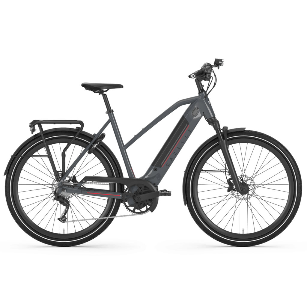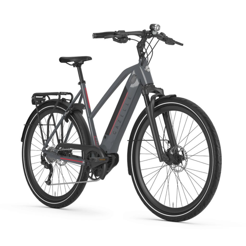 Arrive at work fast and relaxed with the Ultimate T10+ HMB. A dynamic contemporary design combined with the integrated motor and battery give the Gazelle Ultimate T10+ HMB a striking yet stylish presence. The aluminum frame is exceedingly stable, which translates into sporty handling and optimum agility. In addition to high-grade components, a high comfort level has been achieved by using puncture-resistant tires, ergonomic handlebar grips and a suspension front fork.