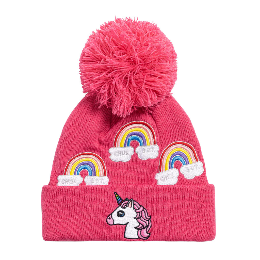 Embroidered rainbows and unicorns inspire the magic in all of us. In high-octane bright colors, this delightful hat is topped off with a ginormous pom.