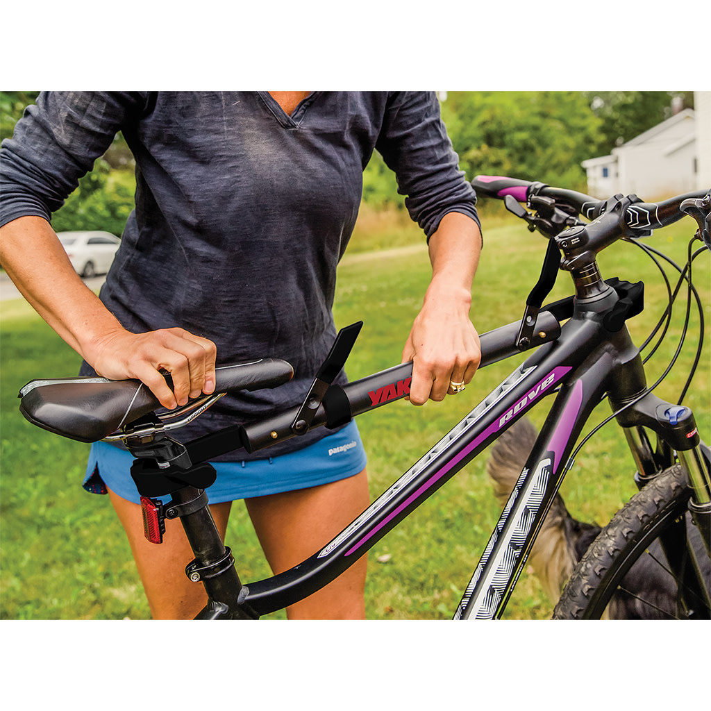 - Installs quickly and securely to your seat post and stem to adapt a wide range of bikes for transport